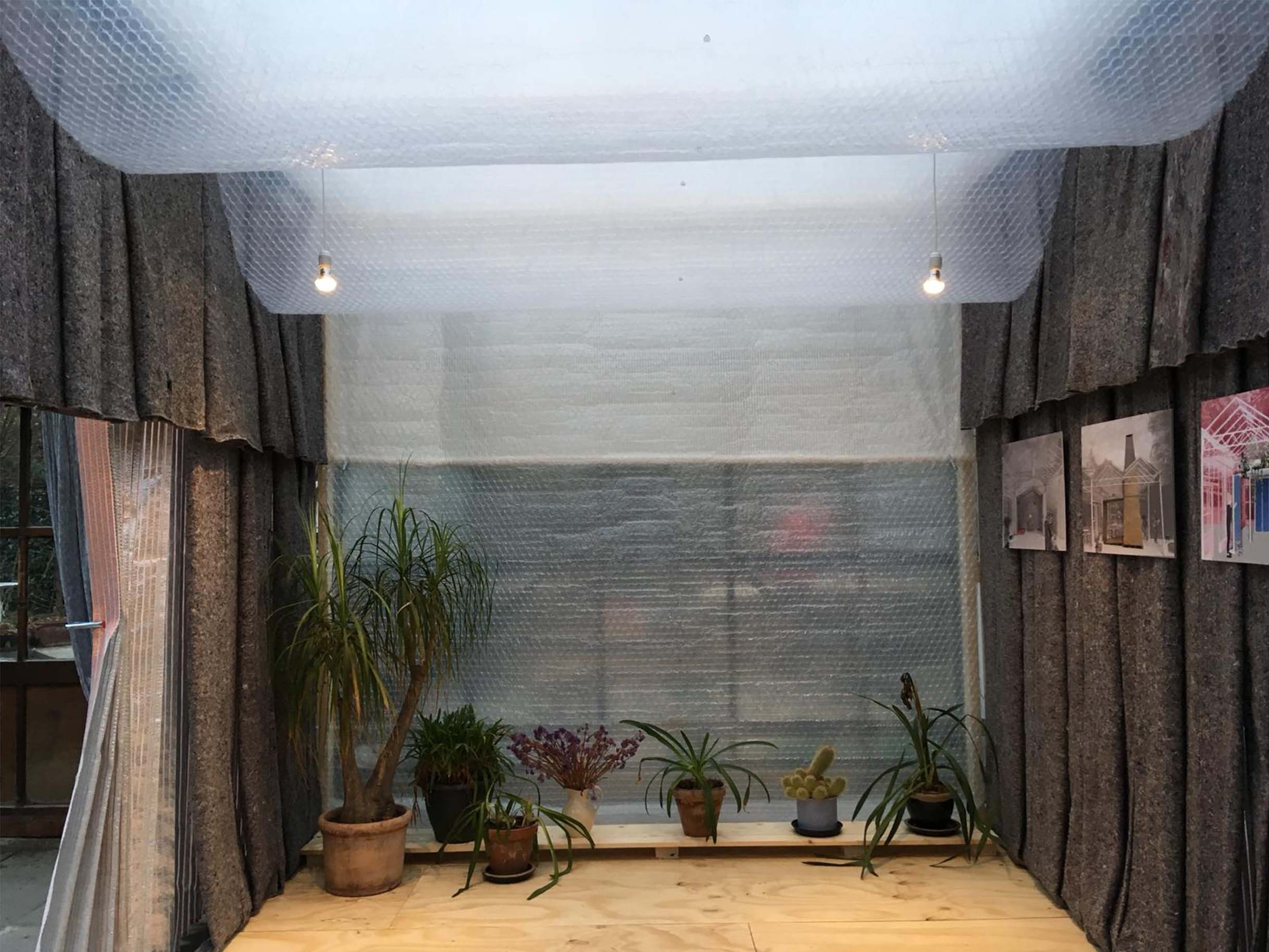 Na eerst individueel ontwerpen gemaakt te hebben, hebben we de ontwerpen samengevoegd, terwijl we ook rekening hielden met het beperkte budget. Daarom kwamen we uit op een constructie van hout dat de vakwerkliggers van de kas omsluit en daar deels de stabiliteit vandaan haalt. Het dak is gemaakt van bubbeltjesplastic dat ook in functionerende kassen gebruikt wordt. Dit materiaal laat licht door, maar heeft ook een isolerende functie. De façade is gemaakt van geschonken kleden die gevouwen zijn en maar op een aantal plaatsen vastgemaakt zijn met garen om ervoor te zorgen dat de kleden weer makkelijk uit elkaar gehaald en hergebruikt kunnen worden. Deze kleden zijn uiteindelijk met touw en klemmen bevestigd aan de constructie en hangen als een soort gordijn. Daarvoor hangt een reflecterend materiaal dat ervoor zorgt dat de warmte beter binnen blijft.