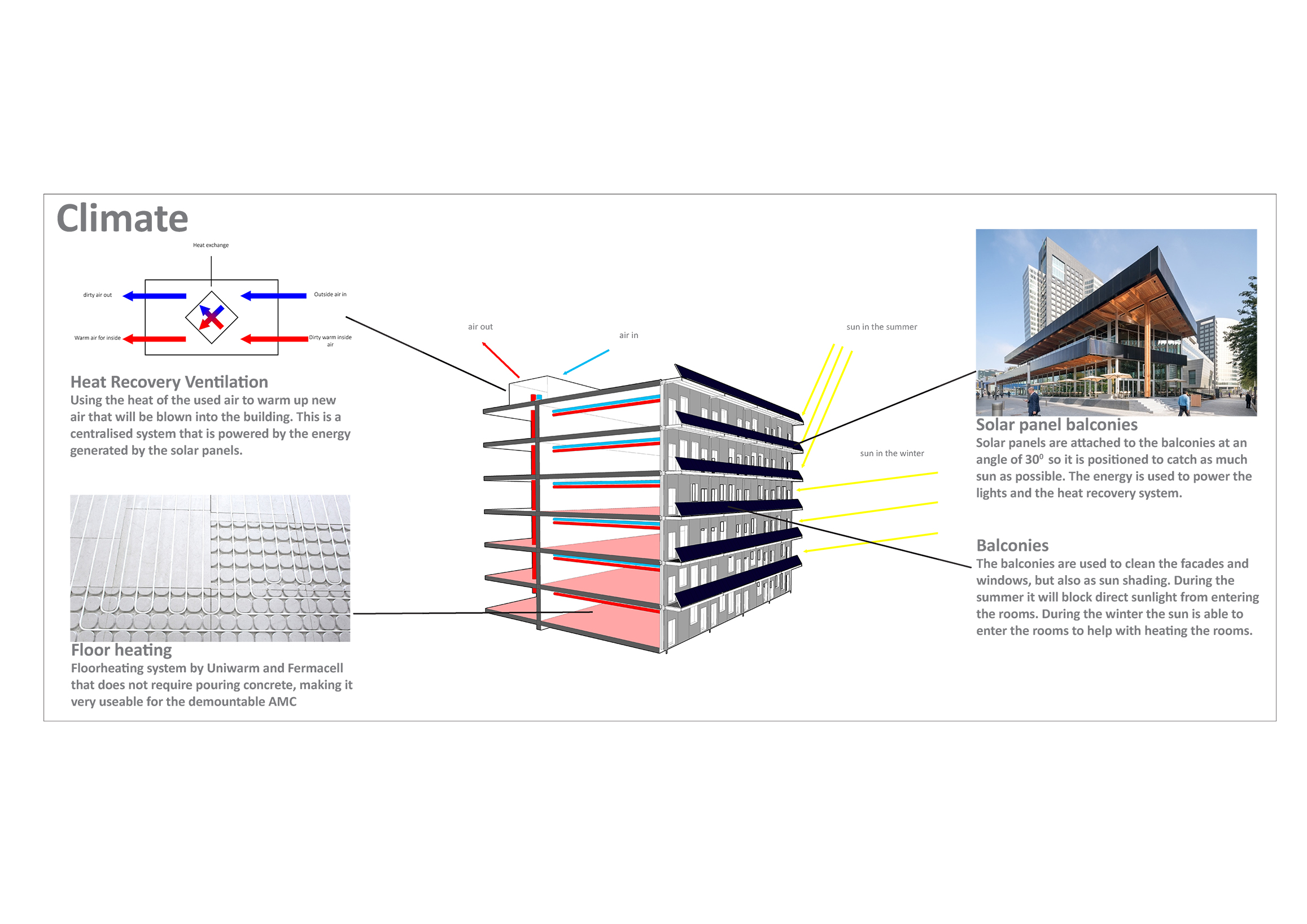 De balkons zijn daarnaast voorzien van relingen waarop zonnepanelen zijn bevestigd, om energie op te wekken en er is gebruik gemaakt van een bestaand systeem van Fermacell en Uniwarm waarbij de vloerverwarming makkelijk te plaatsen is en makkelijk te verwijderen is.