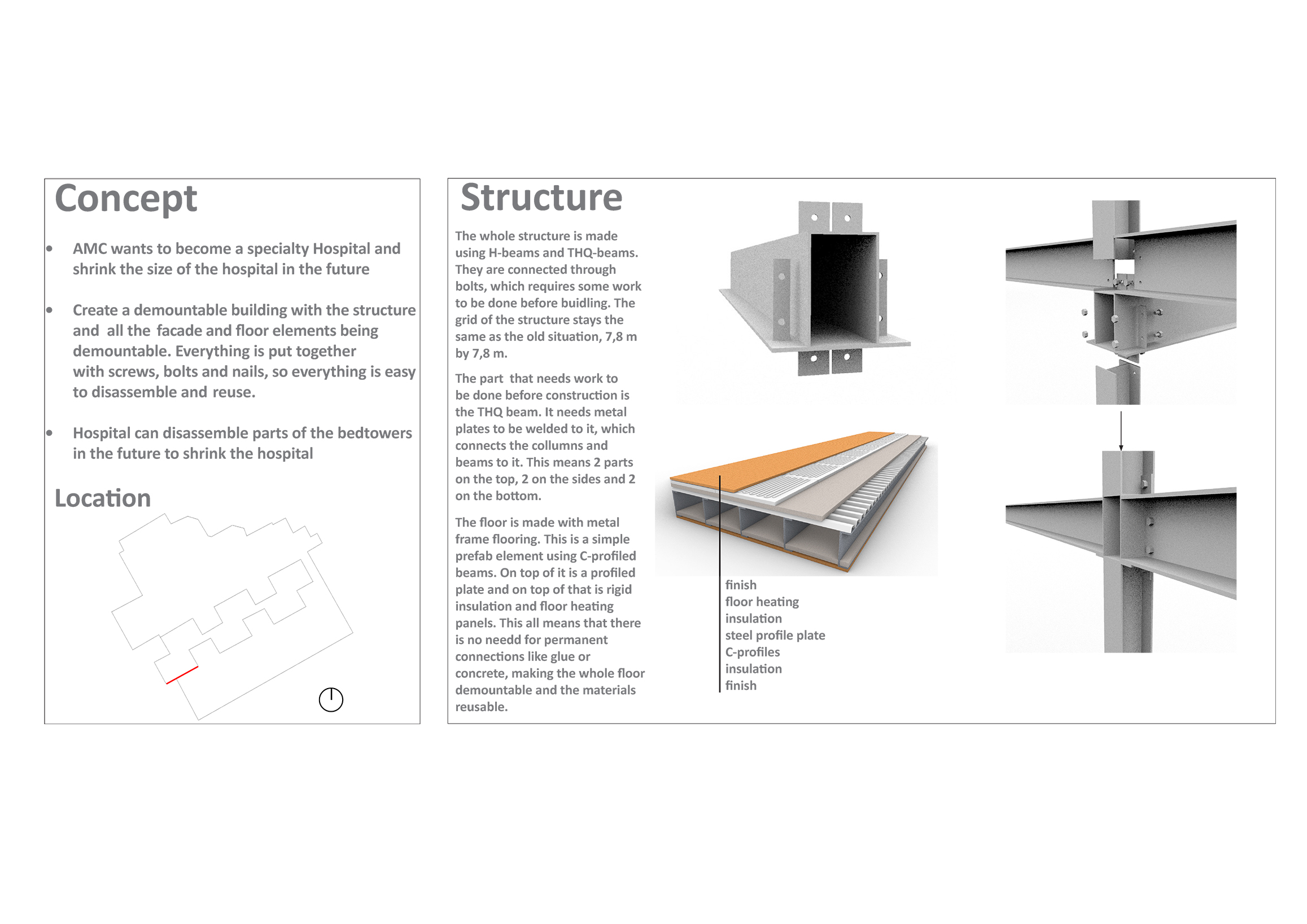 Een van de wensen voor de toekomst van het AMC is om te krimpen, door de patiënten minder lang te laten verblijven in het ziekenhuis en door een meer gespecialiseerd ziekenhuis te worden. Om deze reden heb ik besloten om de gehele bed torens op een manier te herbouwen, zodat deze na een aantal jaar weer met weinig moeite kan worden verkleind of aan het einde wellicht volledig af te breken, terwijl de materialen daarna gewoon weer her te gebruiken zijn. Daarvoor heb ik naar aanleiding van enkele bestaande systemen manieren gevonden om de constructie makkelijk in elkaar te zetten en weer uit elkaar te halen zonder te lassen of andere manieren van permanent bevestigen. Daarnaast is ook een façade systeem bedacht welke bestaat uit prefab elementen die na gebruik ook weer uit elkaar te halen zijn of makkelijk te vervangen zijn.
