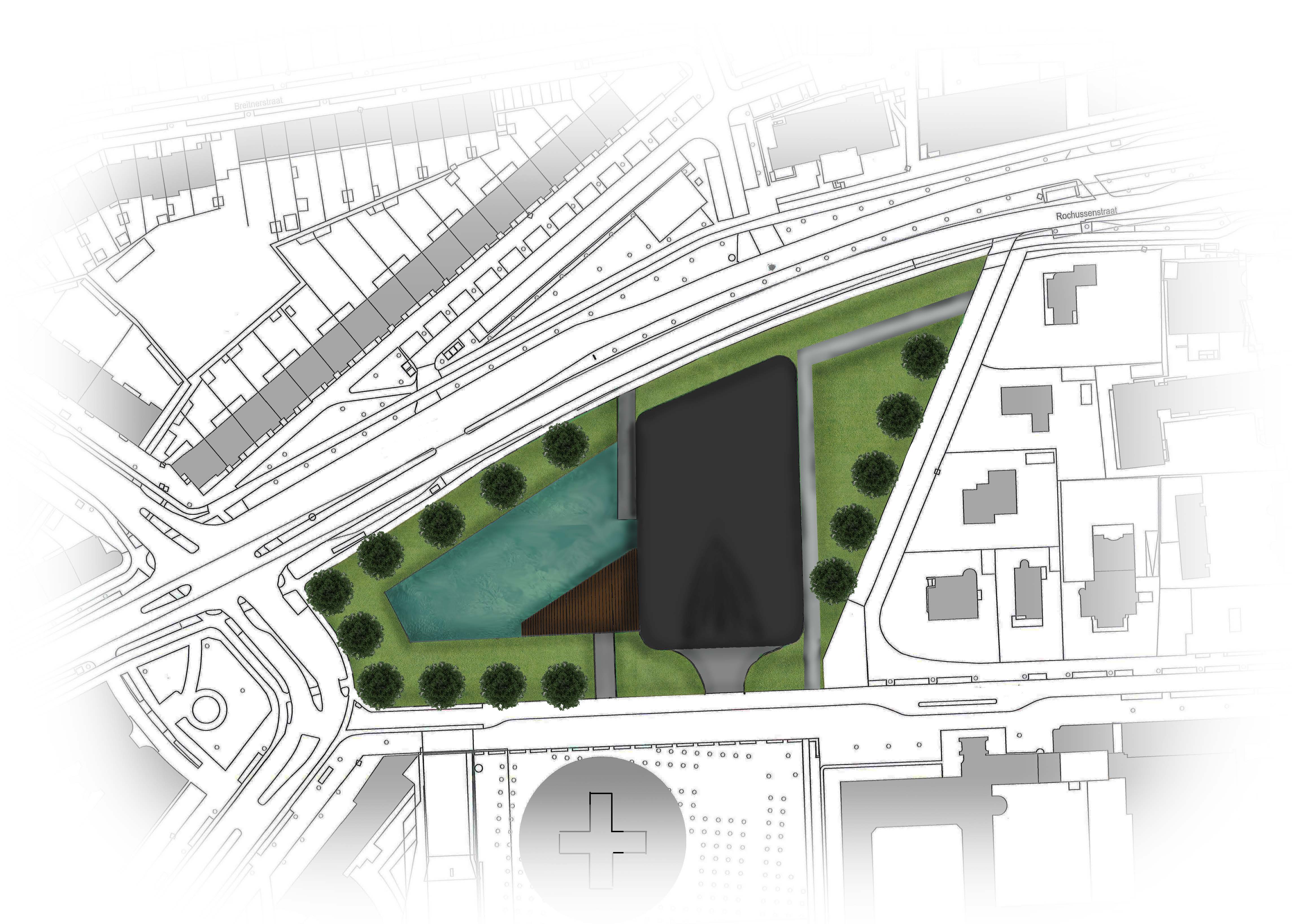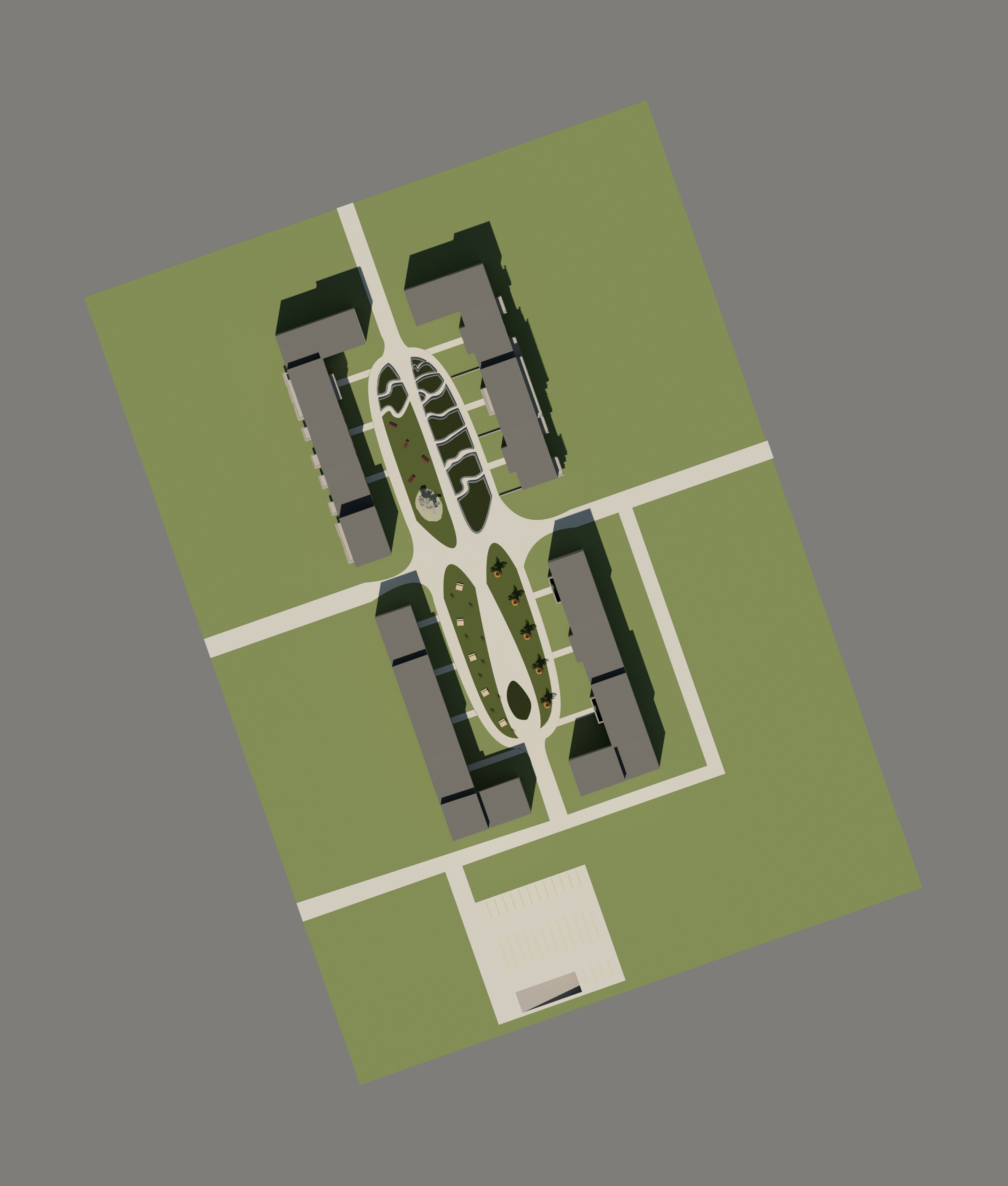 Het idee van het nieuwe ontwerp was om de twee gebouwen met elkaar te verbinden, ze stonden in een l vorm, en daarnaast aan de andere zijde van de openbare ruimte een identieke l maken. Daarna zouden de middenstukken verwijderd worden zodat uiteindelijk 4 l vormige hoeken gecreëerd werden met daarbinnen een openbaar park. Daarnaast werden de openingen op de wanden bekleed met groen, zodat in feite 4 groene poorten gecreëerd worden.