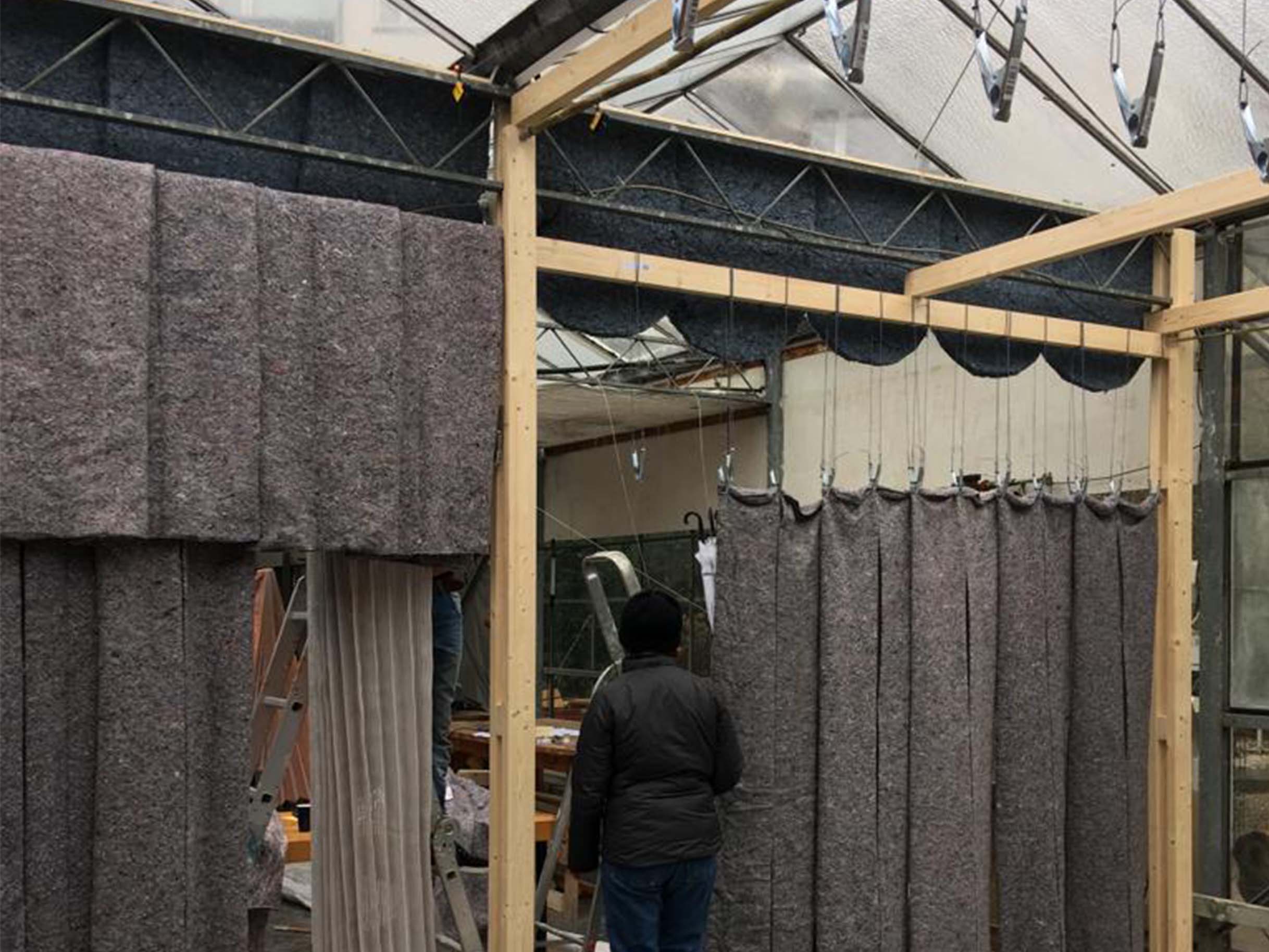 Na eerst individueel ontwerpen gemaakt te hebben, hebben we de ontwerpen samengevoegd, terwijl we ook rekening hielden met het beperkte budget. Daarom kwamen we uit op een constructie van hout dat de vakwerkliggers van de kas omsluit en daar deels de stabiliteit vandaan haalt. Het dak is gemaakt van bubbeltjesplastic dat ook in functionerende kassen gebruikt wordt. Dit materiaal laat licht door, maar heeft ook een isolerende functie. De façade is gemaakt van geschonken kleden die gevouwen zijn en maar op een aantal plaatsen vastgemaakt zijn met garen om ervoor te zorgen dat de kleden weer makkelijk uit elkaar gehaald en hergebruikt kunnen worden. Deze kleden zijn uiteindelijk met touw en klemmen bevestigd aan de constructie en hangen als een soort gordijn. Daarvoor hangt een reflecterend materiaal dat ervoor zorgt dat de warmte beter binnen blijft.
