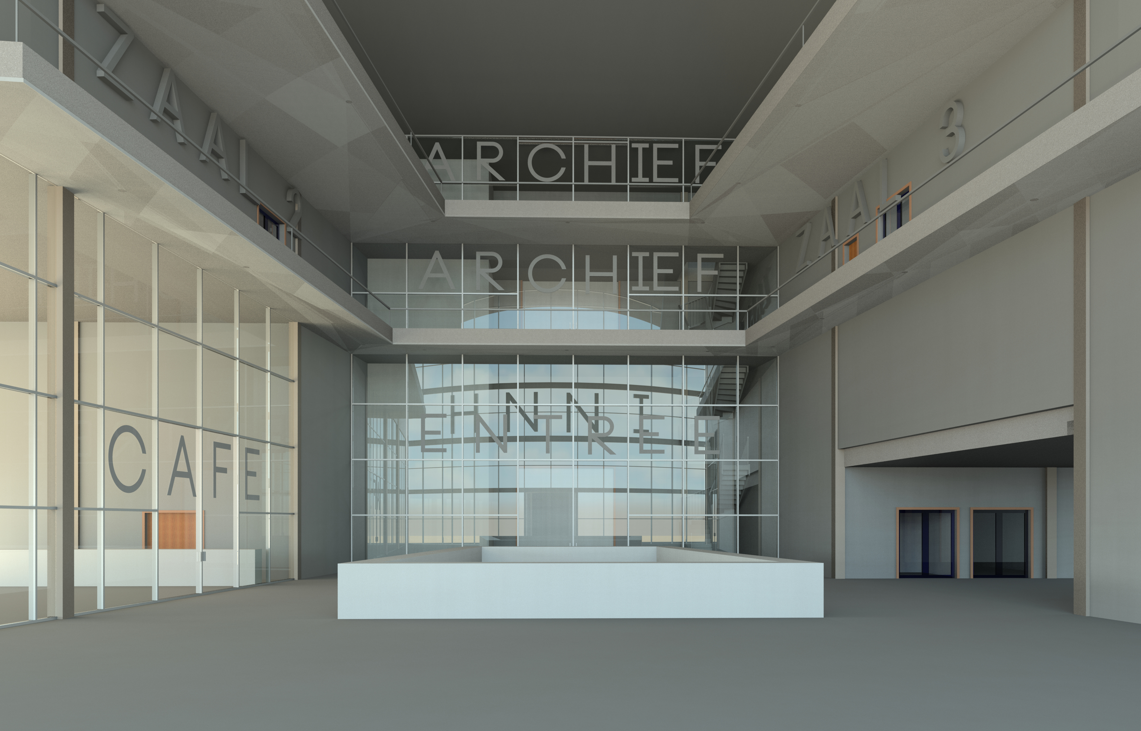 Veel mensen besloten om het archief onder de grond te plaatsen, omdat deze toch geen daglicht mocht hebben. Dat zorgde echter voor problemen, omdat er veel gewicht nodig zou zijn om het archief onder de grond te houden. Daarom besloot ik het boven de grote zaal te plaatsen. Mijn hoofddoel voor dit project was namelijk de bezoeker leiden. Door het gebouw een organische vorm te geven, een verhoogde ingang en door het gebouw geleidelijk meer raam oppervlakte te geven naarmate je dichter bij de inkwam kwam wilde ik de bezoekers naar de ingang leiden. Door het archief bovenin en aan de achterkant van het gebouw te plaatsen, zorgde dit ervoor dat de gehele achterkant boven de eerste verdieping een gesloten gevel had.